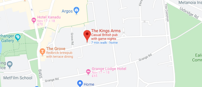 Ealing Gin is on Sale at The Kings ArmsThe Kings Arms is a hidden gem. It's a lovely local pub with a very active, friendly staff. With quiz nights, poker nights, comedy and sports, there always seems to be something going on... and with good food on the menu too. The sunday carvery is a 'must try'.